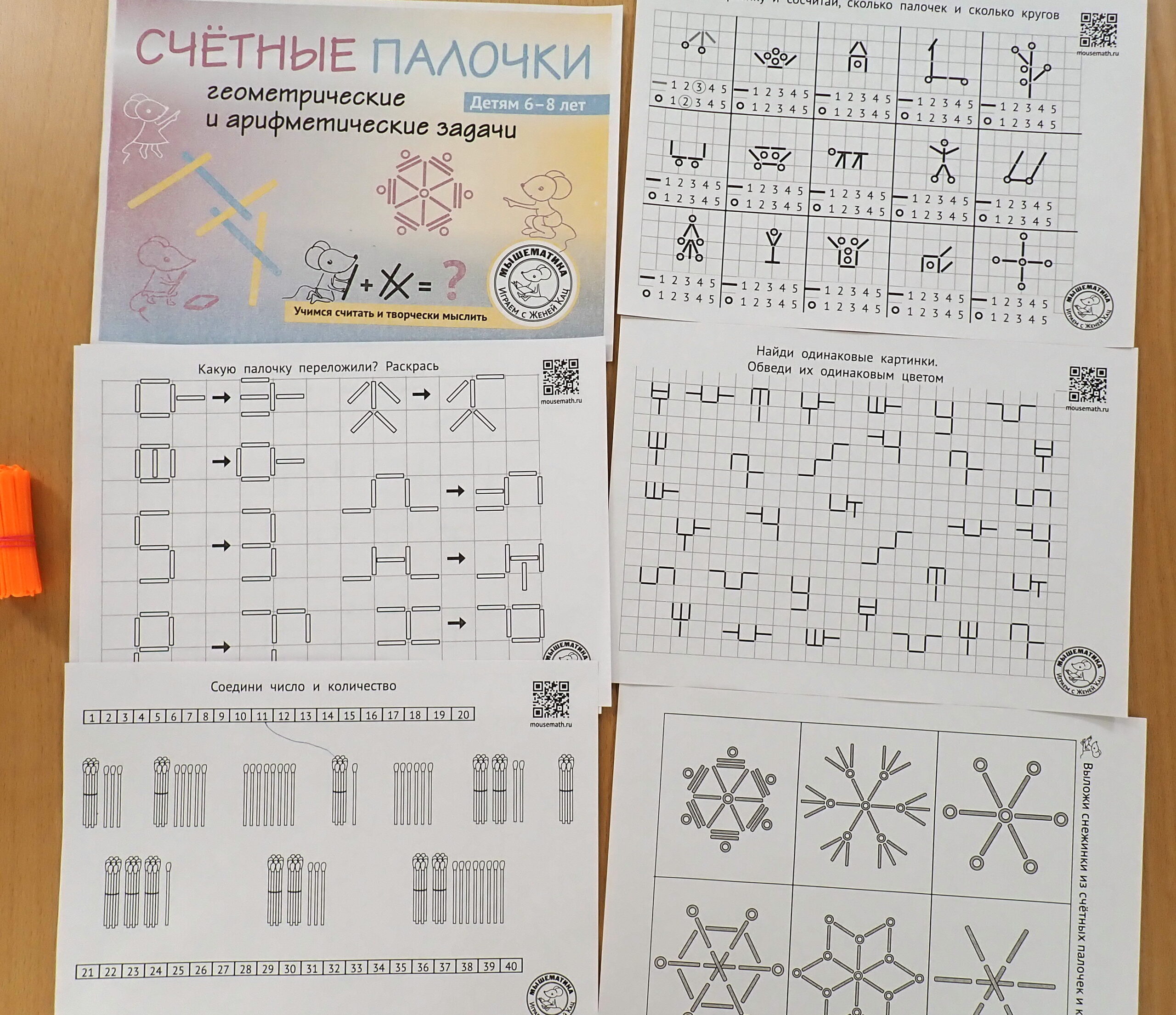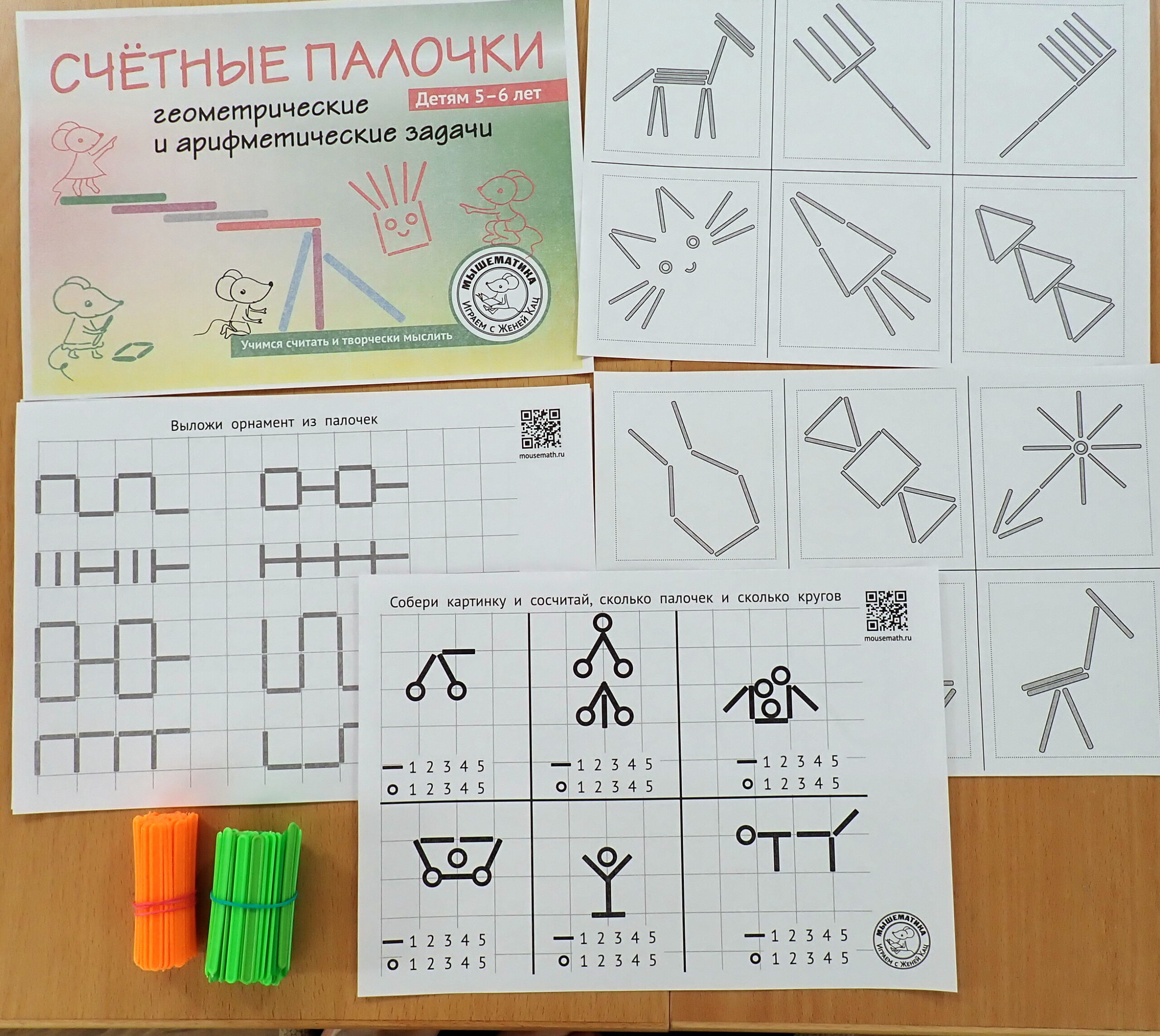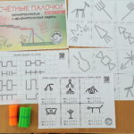 Мы собрали в тетрадку целую коллекцию игр и заданий со спичками и счётными палочками. Это игры на внимание, на масштаб, на повторяющиеся орнаменты, а также на счёт десятками.